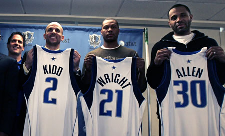 (L-R) Dallas Mavericks owner Mark Cuban, guard Jason Kidd, forward Antoine Wright and forward Malik Allen are pictured at a news conference announcing their trade to the Mavericks from the New Jersey Nets in Dallas, Texas February 19, 2008. [Agencies]