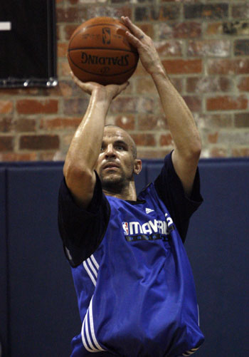 Dallas Mavericks guard Jason Kidd, newly acquired from the New Jersey Nets, participates in a team basketball practice session in Dallas, Texas February 19, 2008. [Agencies]