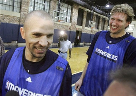 Dallas Mavericks' Dirk Nowitzki, right, and new teammate Jason Kidd speak to reporters after team practice in Dallas, Tuesday, Feb. 19, 2008. Dallas finally got star point guard Jason Kidd traded back to the highly-ranked Western Conference team.[Agencies]