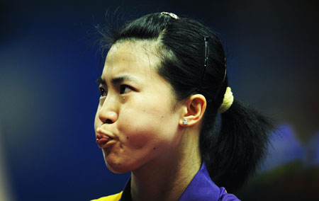 China's Wang Nan reacts after losing a point during her match against North Korea's Kim Jong in the women's preliminaries of the World Team Table Tennis Championships in China's southern city of Guangzhou February 25, 2008. China beat North Korea 3-1 with one losing rubber of Wang Nan. [Xinhua]