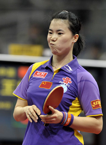China's Wang Nan reacts after losing a point during her match against North Korea's Kim Jong in the women's preliminaries of the World Team Table Tennis Championships in China's southern city of Guangzhou February 25, 2008. China beat North Korea 3-1 with one losing rubber of Wang Nan. [Xinhua]