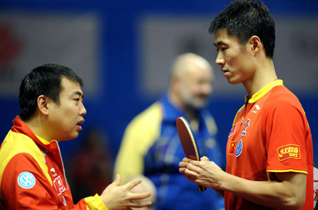 China's coach Liu Guoliang instructs Wang Liqin during their match against Romania at the World Team Table Tennis Championships in Guangzhou of South China February 25, 2008. China beat Romania 3-1 with one losing rubber of Wang in his first outing. [Xinha]