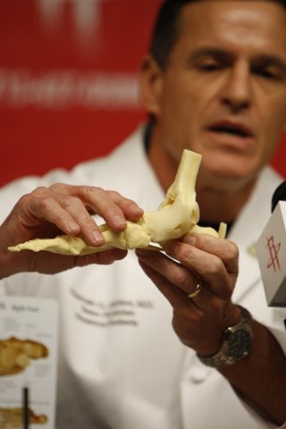 Houston Rockets team doctor Tom Clanton explains star center Yao Ming's affected part with a foot and ankle model at a press conference announcing Yao would not play for the rest of the NBA basketball season due to a stress fracture in his left foot Tuesday, Feb. 26, 2008 in Houston. [Sina]