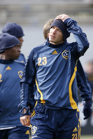 Los Angeles Galaxy midfielder David Beckham (front) participates in a training session before the team's exhibition soccer match with FC Seoul on Saturday at the Seoul World Cup Stadium February 28, 2008. [Agencies]