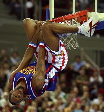 A member of the Harlem Globetrotters basketball team nicknamed Airport hangs on to the hoop after he makes a dunk during an exhibition match in Budapest February 28, 2008. [Agencies]