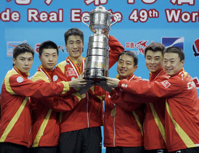 Updated: 2008-03-03 08:47 GUANGZHOU, China -- China claimed the men's team title at the world team table tennis championships after storming over the ambitious South Korea on home turf Sunday. The victory was scored one day after China edged out Singapore to win the women's team title.