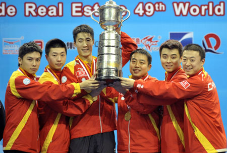 Members of China's men's table tennis team (from L) Chen Qi, Ma Long, Wang Liqin, coach Liu Guoliang, Wang Hao and Ma Lin lift their trophy on the podium after beating South Korea in the men's final of the World Team Table Tennis Championships in the southern Chinese city of Guangzhou March 2, 2008. [Xinhua]