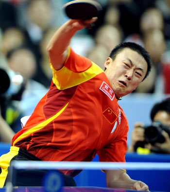 China's Ma Lin returns a shot to South Korea's Ryu Seung Min in the first outing during the men's final at the World Team Table Tennis Championships in Guangzhou of South China. Ma beat the South Korean Olympic champion 3-1 to give China a 1-0 lead. [Xinhua]