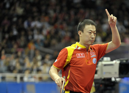 China's Ma Lin celebrates a point against South Korea's Ryu Seung Min in the first outing during the men's final at the World Team Table Tennis Championships in Guangzhou of South China. Ma beat the South Korean Olympic champion 3-1 to give China a 1-0 lead. [Xinhua]