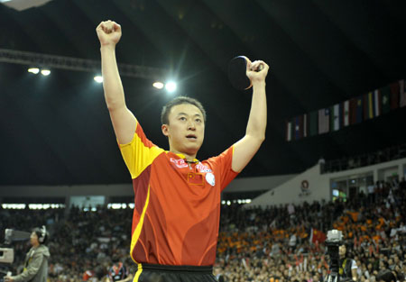 China's Ma Lin celebrates his victory over South Korea's Ryu Seung Min in the first outing during the men's final at the World Team Table Tennis Championships in Guangzhou of South China. Ma beat the South Korean Olympic champion 3-1 to give China a 1-0 lead. [Xinhua]