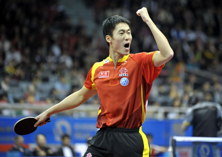 China's Wang Liqin celebrates a point over South Korea's Joo Se Hyuk during the third round of the men's final at the World Team Table Tennis Championships in Guangzhou of South China. Wang sealed the victory for China with a clean sweep over Joo 3-0. [Xinhua]