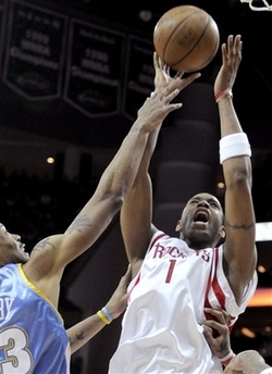 Houston Rockets' Tracy McGrady (1) is fouled by Denver Nuggets' Marcus Camby, left, as he goes to the basket during the second half of an NBA basketball game Sunday, March 2, 2008 in Houston. The Rockets logged their 15th straight win, beating the Nuggets 103-89. [Agencies]