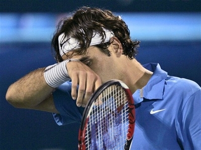 Roger Federer of Switzerland reacts after he misses a ball against Andy Murray from Great Britain during the 1st round of Dubai Tennis Championship in Dubai, Monday, March 3, 2008. [Agencies]