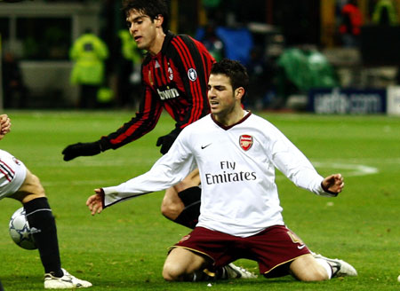 AC Milan's Kaka (L) challenges Arsenal's Cesc Fabregas during their Champions League first knockout round, second leg soccer match at the San Siro stadium in Milan March 4, 2008. [Agencies]
