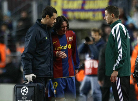 Barcelona's Lionel Messi (C) cries after leaving the pitch during their Champions League first knockout round, second leg soccer match against Celtic in Barcelona, March 4, 2008. [Agencies]