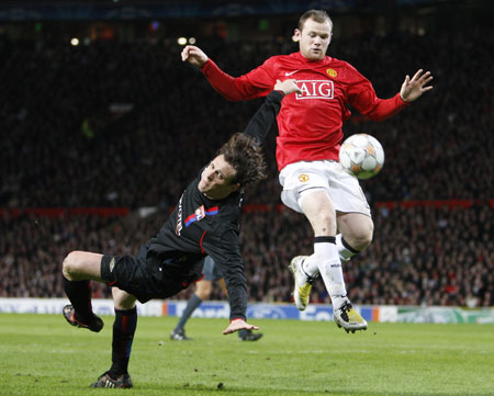 Manchester United's Wayne Rooney (R) is challenged by Lyon's Sebastien Squillaci during their Champions League first knockout round, second leg soccer match at Old Trafford in Manchester, northern England March 4, 2008. [Agencies]