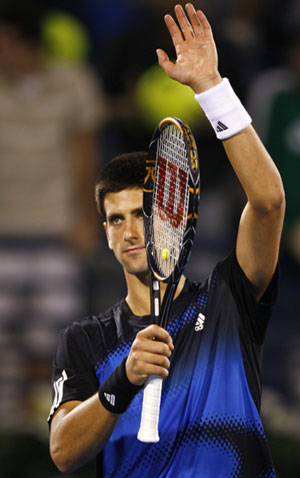Serbia's Novak Djokovic waves after winning the match against Croatia's Marin Cilic at the ATP Dubai Tennis Championships, March 4, 2008. [Agencies]
