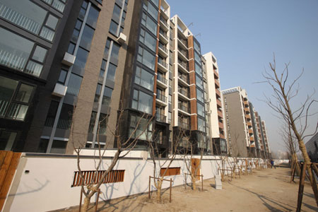 Apartment buildings stand in the Olympic Village in this photo taken on March 5, 2008. The Organizing Committee for the Games of the 29th Olympiad (BOCOG) unveiled the village to the press on Wednesday. [Xinhua]