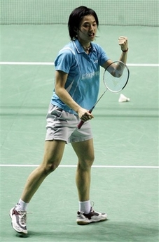Yip Pui Yin of Hong Kong, reacts after beating number one seed Xie Xingfang, in the women's singles first-round match, at the All England Badminton Championships in the National Indoor Arena, Birmingham, England, Wednesday, March 5, 2008. [Agencies]