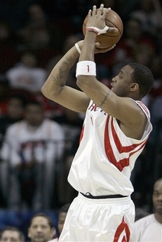 Houston Rockets' Tracy McGrady shoots for three points against the Indiana Pacers during the first half of a basketball game Wednesday, March 5, 2008 in Houston. McGrady scored 25 points in the Rockets 117-99 win. [Agencies]