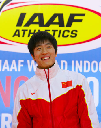 China's Liu Xiang smiles during the victory ceremony of the men's 60m hurdles final at the 12th IAAF World Indoor Athletics Championship in Valencia March 8, 2008. Liu clocked 7.46 seconds to claim his first indoor title. [Xinhua]