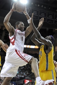 Houston Rockets' Tracy McGrady (1) goes to the basket against New Orleans Hornets' Julian Wright, right, during the second half of a basketball game Saturday, March 8, 2008, in Houston. The Rockets won, 106-96, McGrady scored 41 points in the game. [Agencies]