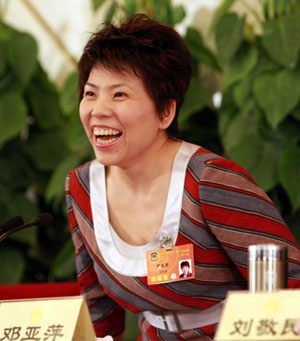 Deng Yaping, former table tennis Olympic champion and deputy director of the Olympic Village of BOCOG, attends a press conference on the sidelines of the annual session of the top political advisory body at the Great Hall of the People in Beijing, March 12, 2008. [Xinhua]