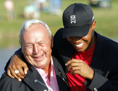 Golfing great Arnold Palmer (L) laughs with Tiger Woods after Wood's win at the Arnold Palmer Invitational golf tournament in Orlando March 16, 2008. [Agencies]