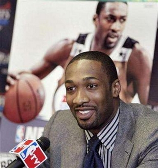Gilbert Arenas of the Washington Wizards talks to the media before the Wizards' NBA playoff game against the Cleveland Cavaliers in Washington April 28, 2007. [Agencies]