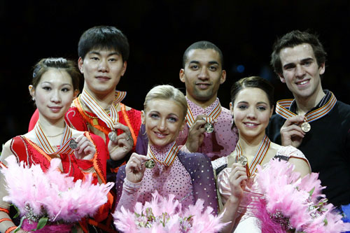 Figure skaters (L-R) Zhang Dan and Zhang Hao of China, Aliona Savchenko and Robin Szolkowy of Germany and Jessica Dube and Bryce Davison of Canada pose with their medals on the podium after winning pairs free skating programme at the World Figure Skating Championships in Gothenburg March 19, 2008. [Agencies]
