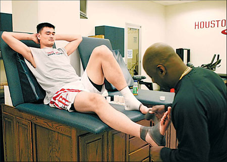 Basketball celebrity Yao Ming of the Houston Rockets has his ankles taped, in preparation for a game against the Cleveland Cavaliers on Feb 7 at the Toyota Center in Houston, Texas. [Getty Images]