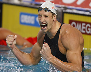 Alain Bernard of France reacts after his men's 100m freestyle semi-final at the European Swimming Championships in Eindhoven March 21, 2008. [Agencies]