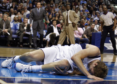 Dallas Mavericks forward Dirk Nowitzki lies on the floor holding his knee after sustaining an injury in the second half of their NBA basketball game in Dallas, Texas March 23, 2008. Nowitzki left the game and did not return. [Agencies]