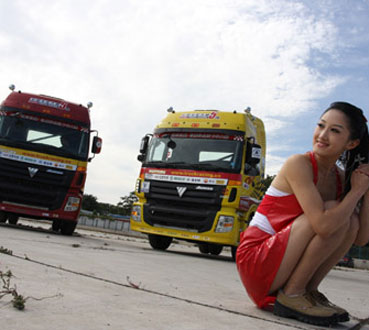 A cheerleader poses with trucks during China Truck Racing 2007 final in October at Beijing.