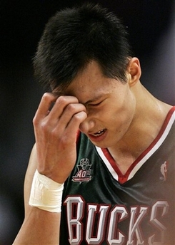 Milwaukee Bucks' Yi Jianlian, of China, reacts after his team turned the ball over with less than 15 seconds remaining in the fourth quarter of an NBA basketball game against the Chicago Bulls on Saturday, March 29, 2008, in Chicago. The Bulls won 114-111. [Agencies]