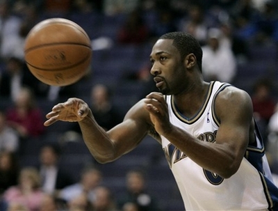 Washington Wizards guard Gilbert Arenas puts the ball in play during the first quarter of an NBA basketball game, Wednesday, April 2, 2008, in Washington. [Agencies]