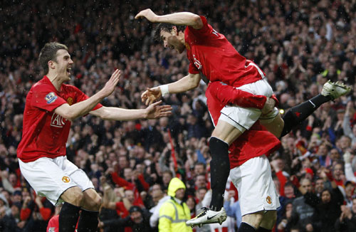 Manchester United's Owen Hargreaves (top R) celebrates with Wayne Rooney (bottom R) and Michael Carrick (L) after scoring during their English Premier League soccer match against Arsenal at Old Trafford in Manchester, northern England April 13, 2008. [Agencies]