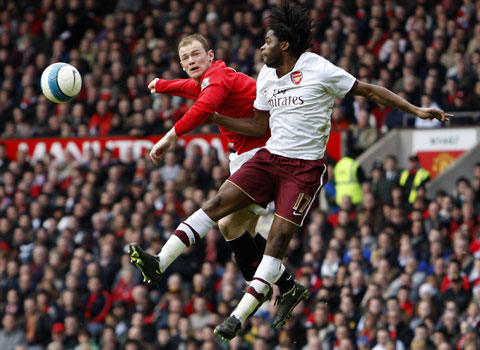 Manchester United's Wayne Rooney (L) challenges Arsenal's Alexandre Song for the ball during their English Premier League soccer match at Old Trafford in Manchester, northern England April 13, 2008.