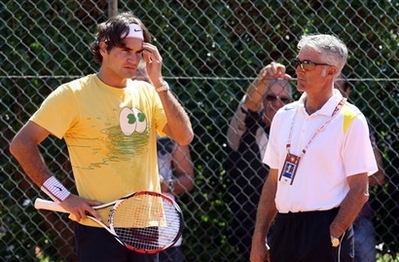World number one tennis player Roger Federer, left, from Switzerland, talks with his new coach Jose Higueras during a training session on the courts of the Estoril Tennis Open in Oeiras, outside Lisbon, Monday, April 14 2008. Federer will be participating in the tournament that started Monday. [Agencies]