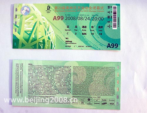 A sample ticket for the closing ceremony of the Beijing 2008 Olympic Games is unveiled by the Beijing Organizing Committee for the Games of the XXIX Olympiad (BOCOG) in Beijing April 23, 2008. The tickets have the design of the Bird's Nest on them. The third round of tickets sale will start from May 5. [BOCOG]