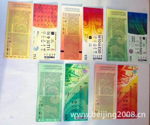 A full set of sample tickets for the Beijing 2008 Olympic Games is unveiled by the Beijing Organizing Committee for the Games of the XXIX Olympiad (BOCOG) in Beijing April 23, 2008. The tickets, with the "lucky cloud" and the Bird's Nest designs will go on sale for the third round starting from May 5. [BOCOG]
