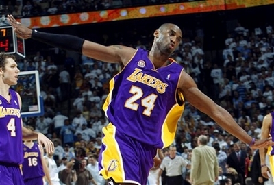 Los Angeles Lakers guard Kobe Bryant soars back to the bench after hitting a basket against the Denver Nuggets during the fourth quarter in Game 4 of a first-round NBA playoff basketball series Monday, April 28, 2008, in Denver. The Lakers beat the Nuggets 107-101 to sweep the series. [Agencies]
