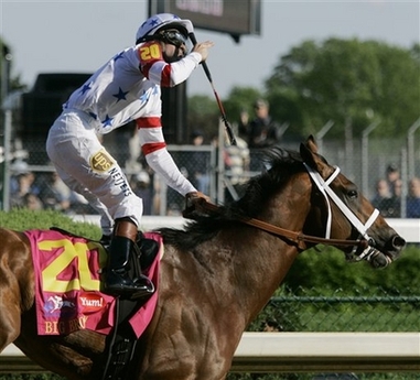 Big Brown's start from the outside post did little to hamper his charge when the field turned for home. Under the urging of Desormeaux, the 2-1 favorite cruised to an easy victory to become the seventh undefeated Derby winner. The last one was Barbaro in 2006.