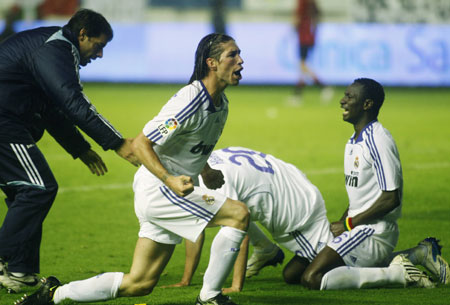 Real Madrid's Sergio Ramos (2nd L), Gonzalo Higuain (2nd R) and Mahamadou Diarra (R) celebrate winning the Spanish First Division soccer league after defeating Osasuna at Reyno de Navarra stadium in Pamplona May 4, 2008. [Agencies]