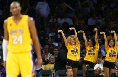 Los Angeles Lakers cheerleaders wear T-shirts celebrating Lakers' player Kobe Bryant (L) winning the NBA's MVP this season, as they play the Utah Jazz during Game 2 of their NBA Western Conference semi-final basketball series in Los Angeles, California, May 7, 2008. [Agencies]