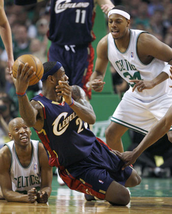Cleveland Cavaliers' Lebron James (C) grabs a loose ball between Boston Celtics' Sam Cassell (L) and Paul Pierce (34) during the second quarter of Game 2 of their NBA Eastern Conference semi-final basketball playoff series in Boston, Massachusetts May 8, 2008. [Agencies]