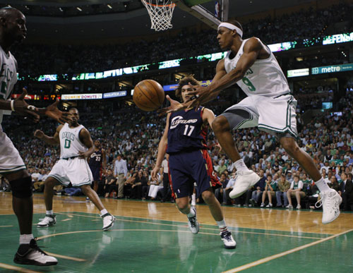 Boston Celtics' Rajon Rondo (R) saves the ball to teammate Kevin Garnett (L) as Cleveland Cavaliers' Anderson Varejao (17) follows the action during the second half of Game 2 of their NBA Eastern Conference semi-final basketball playoff series in Boston, Massachusetts May 8, 2008. [Agencies]