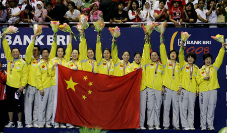 Updated: 2008-05-18 14:57 ![]() Members of China's badminton team celebrate after beating Indonesia during the finals of the Uber Cup badminton championship in Jakarta May 17, 2008. [Xinhua]