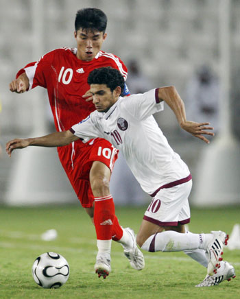 Qatar's Hussain Yasser (R) fights for the ball with China's Zheng Zhi during their World Cup qualifying soccer match in Doha June 2, 2008. [Agencies]