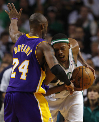 Boston Celtics' Paul Pierce (R) tries to get around Los Angeles Lakers' Kobe Bryant during the second quarter in Game 1 of the NBA Finals basketball championship in Boston June 5, 2008. [Agencies]